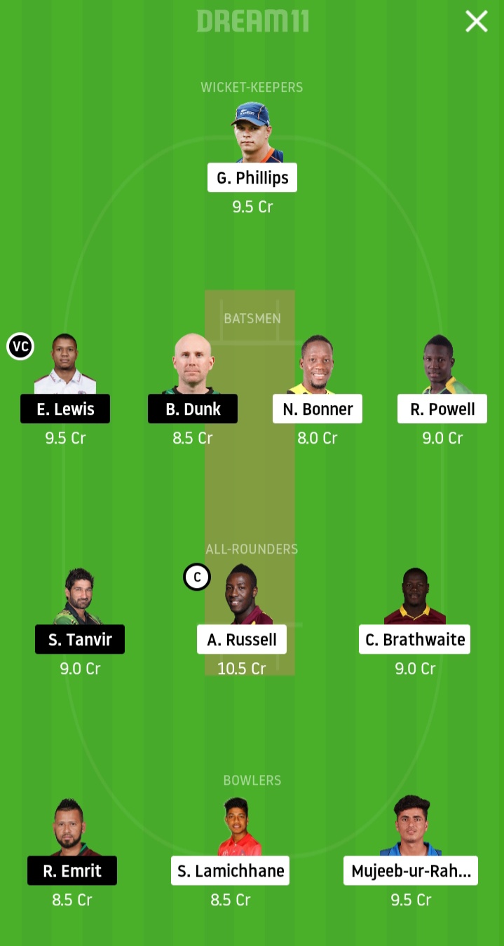 Nicholas Kirton, Glenn Phillips, Rovman Powell (C), Andre Russell, Asif Ali, Jermaine Blackwood, Carlos Brathwaite, Mujeeb ur Rehman, Sandeep Lamichhane, Fidel Edwards and Veerasammy Permaul