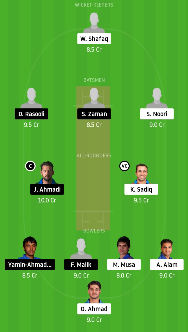 Murad Muradi (WK), Darwish Rasooli, Farhan Zakhail, Shawkat Zaman, Juma Gul, Javed Ahmadi, Zahid Zakhail, Fitratullah Khawari, Yamin-Ahmadzai, Farid Malik, Batin Shah