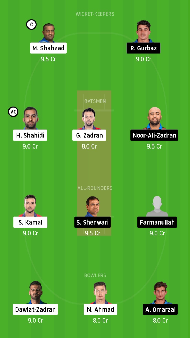 Rahmanullah Gurbaz (WK), Noor-Ali-Zadran, Samiullah Shenwari, Azmatullah Omarzai, Naveen-ul-Haq, Mujeeb-ur-Rahman, Ziaur Rahman Sharifi, Sediqullah Atal, Abdul Rahim Mangal, Rahmanullah Zadran, Farmanullah