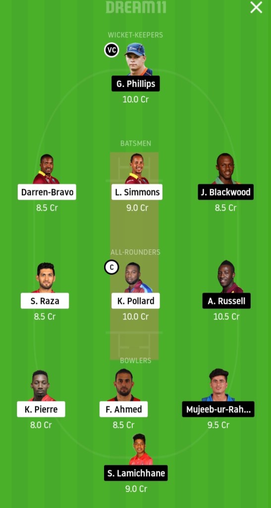 Glenn Phillips (wk), Jermaine Blackwood, Chadwick Walton, Rovman Powell (c), Andre Russell, Asif Ali, Carlos Brathwaite, Sandeep Lamichhane, Mujeeb Ur Rahman, Fidel Edwards, Oshane Thomas.