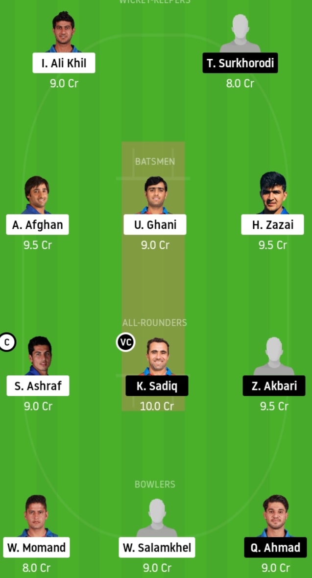 Tamim Surkhorodi, Zubaid Akbari, Majeed Alam(wk), Karim Sadiq (c), Waheedullah Shafaq, Abdullah Adil, Perwez Malikzai, Nasir Khan, Qais Ahmad, Zahid Khan, Aftab Alam.