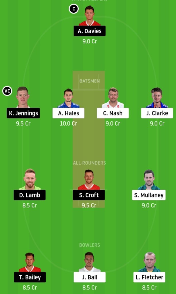 Dane Vilas (WK), Keaton Jennings,Alex Davies, Steven Croft, Liam Hurt, Matt Parkinson, Saqib Mahmood, James Anderson, Richard Gleeson, Luke Wood, George Balderson.