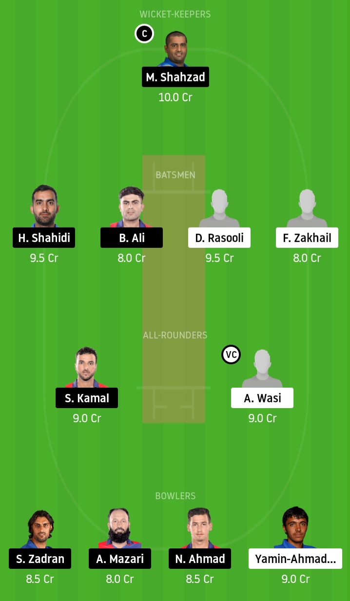 Mohammad Shahzad, Afsar Zazai, Hashmatullah Shahidi, Najeeb Tarakai, Sadiqullah Pacha, Bahar Ali, Ghamai Zadran, Mohammad Bilal, Pakhtoon Sarfaraz, Mohammad Nabi, Shahidullah Kamal, Abdul Rhaman, Ibrahim Khan, Abidullah Taniwal, Zabiullah Sardarzai, Dawlat-Zadran, Abdul Baqi, Jamshid Miralikhil, Noor Ahmad, Abdullah Mazari, Shapoor Zadran, Mohammadullah Hamkar, Hanif Zadran.