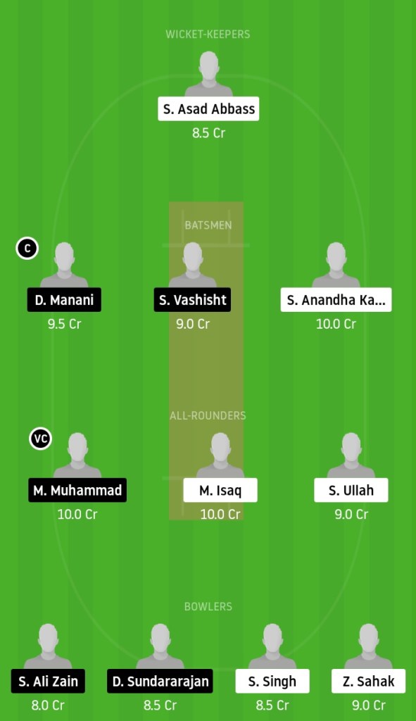 Imran- Haider (WK), Dharmendra Manani, Kaustubh Chavan, Rajesh- Kumar Jr, Shantanu Vashisht, Moiz Muhammad, Ramesh Satheesan, Abhishek Stan Ahuja, Syed Ali Zain, Divakharr Sundararajan, Aftab Ahmed Kayani