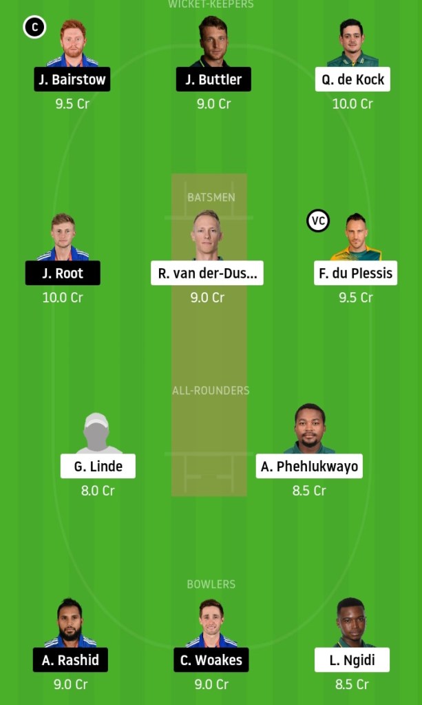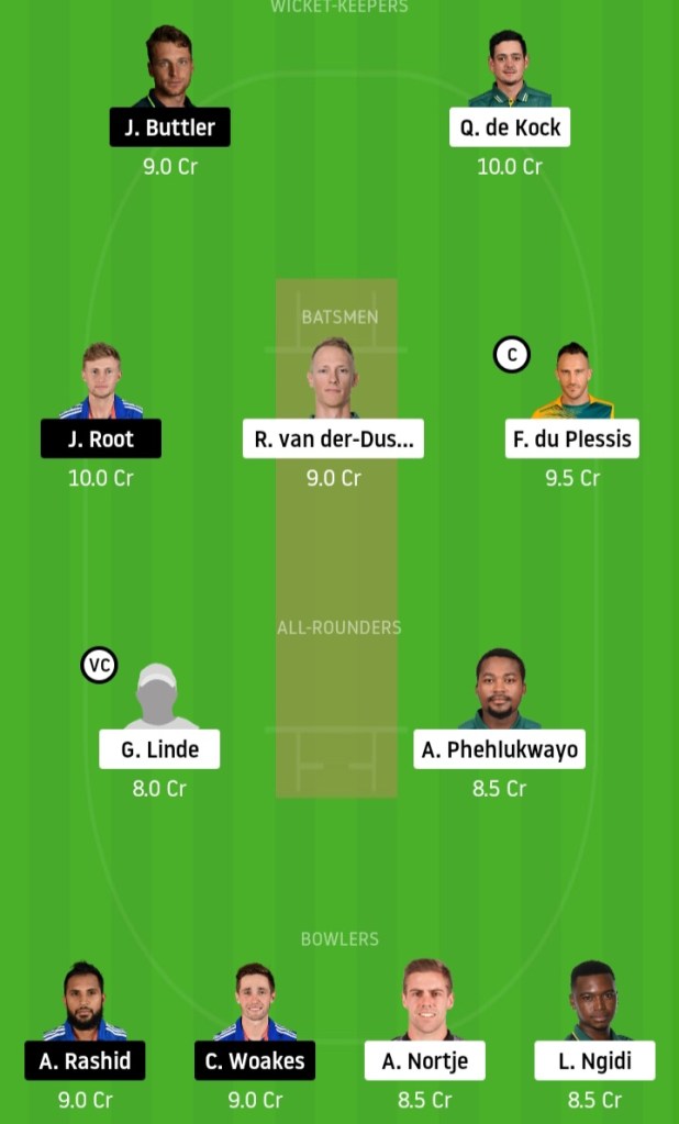 Quinton de Kock, Faf du Plessis, David Miller, Beuran Hendricks, Kyle Verreynne, Lutho Sipamla, Kagiso Rabada, Heinrich Klaasen, Tabraiz Shamsi, Lungisani Ngidi, Rassie van der Dussen, Temba Bavuma, Bjorn Fortuin, George Linde, Junior Dala, Reeza Hendricks, Keshav Maharaj, Pite van Biljon, JJ Smuts, Andile Phehlukwayo, Janneman Malan, Anrich Nortje, Glenton Stuurman, Dwaine Pretorius